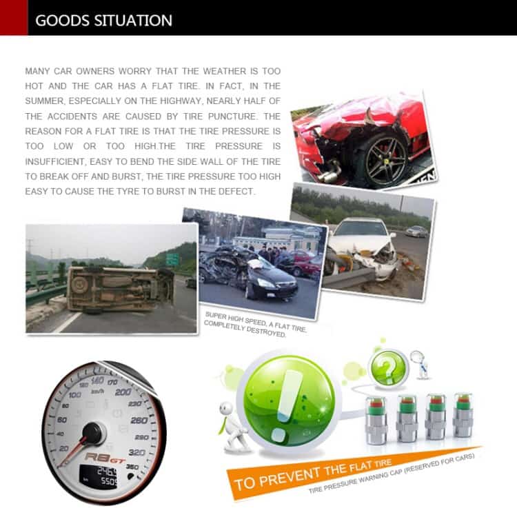 Function: Simply install on the air valve. According to the recognized color to display the pressure of the tire, red and yellow indication bar: tire pressure at below 2.0 Bar (Less than 75% of the standard), DANGER; Yellow and Green indication bar: tire pressure at 2.3-2.0 Bar (Less than 90% of the standard), WARNING; Green indication bar: tire pressure at normal range 2.4 Bar, SAFE.