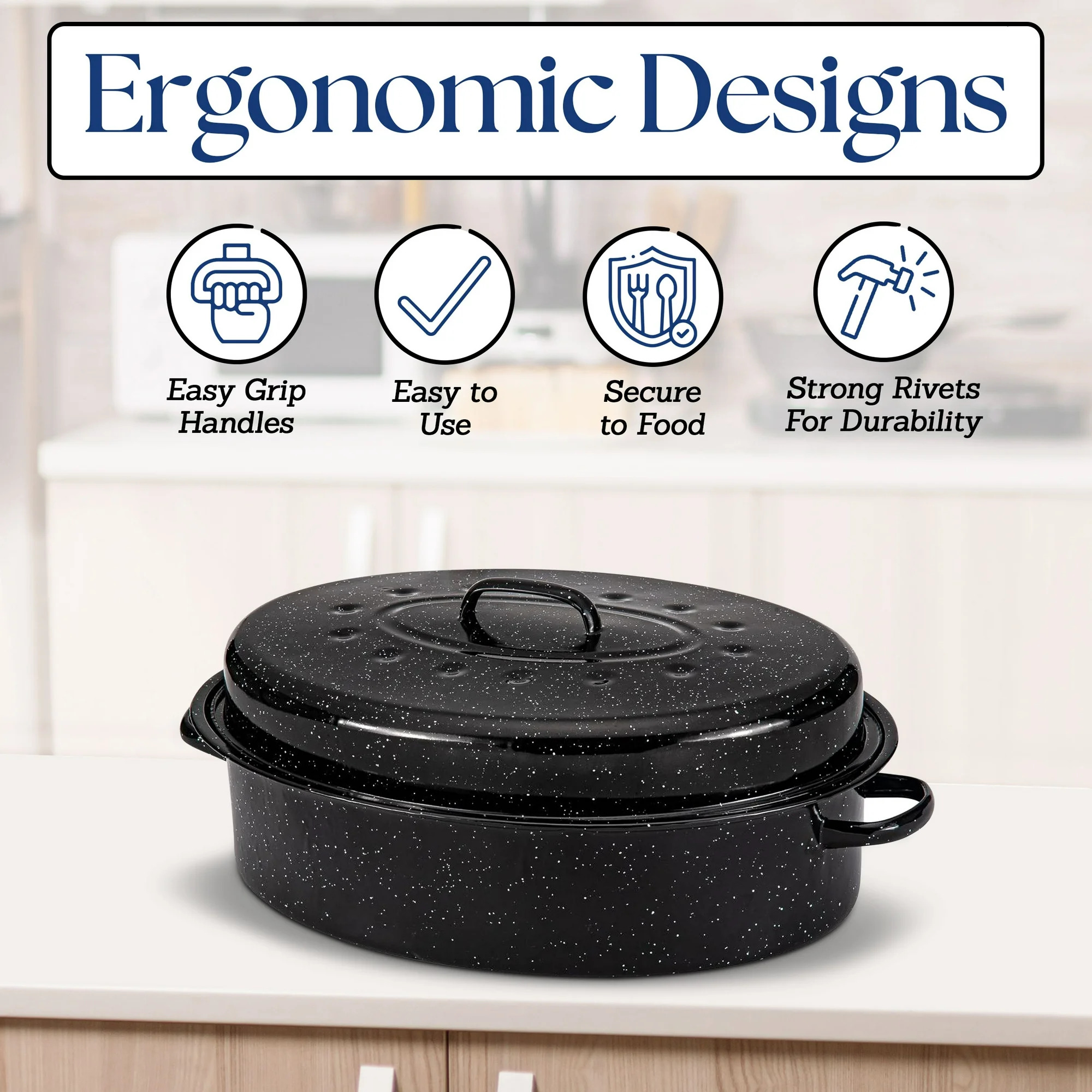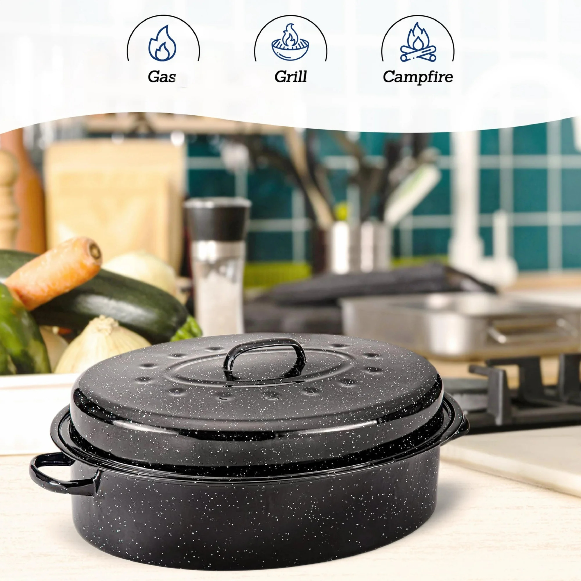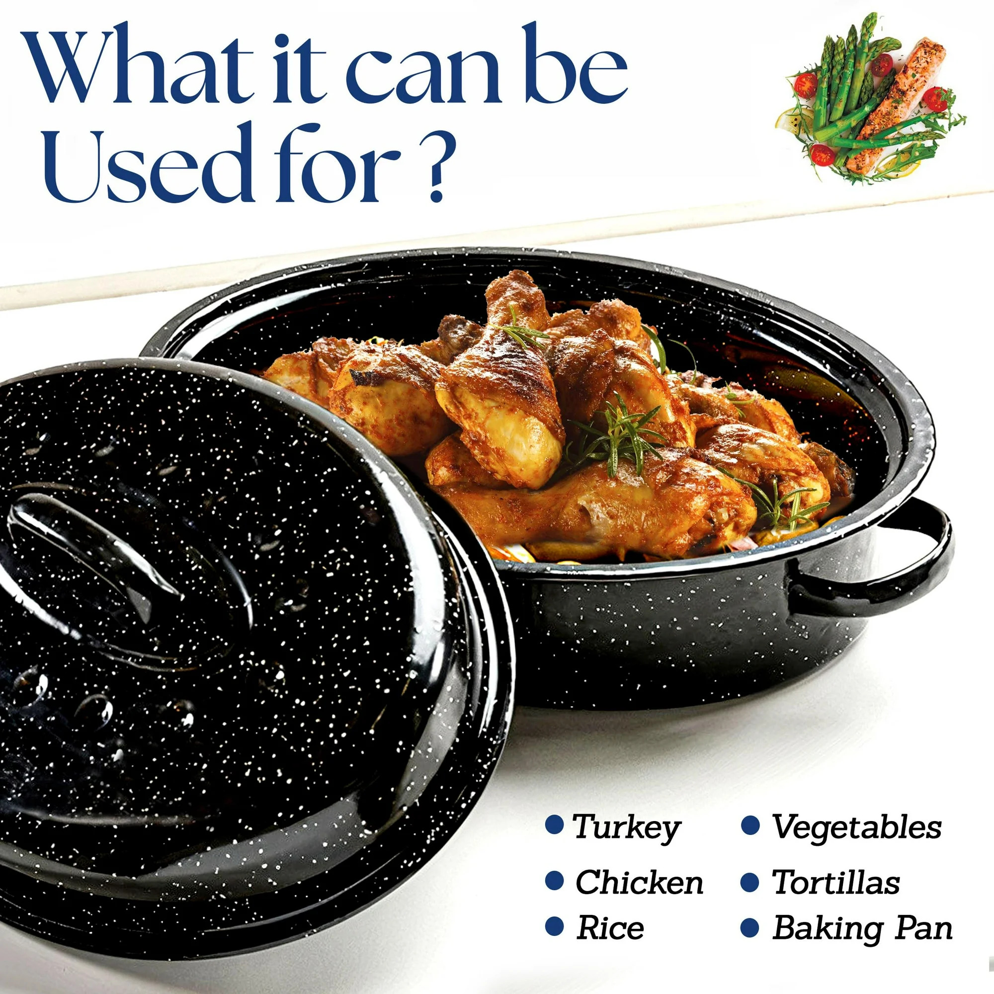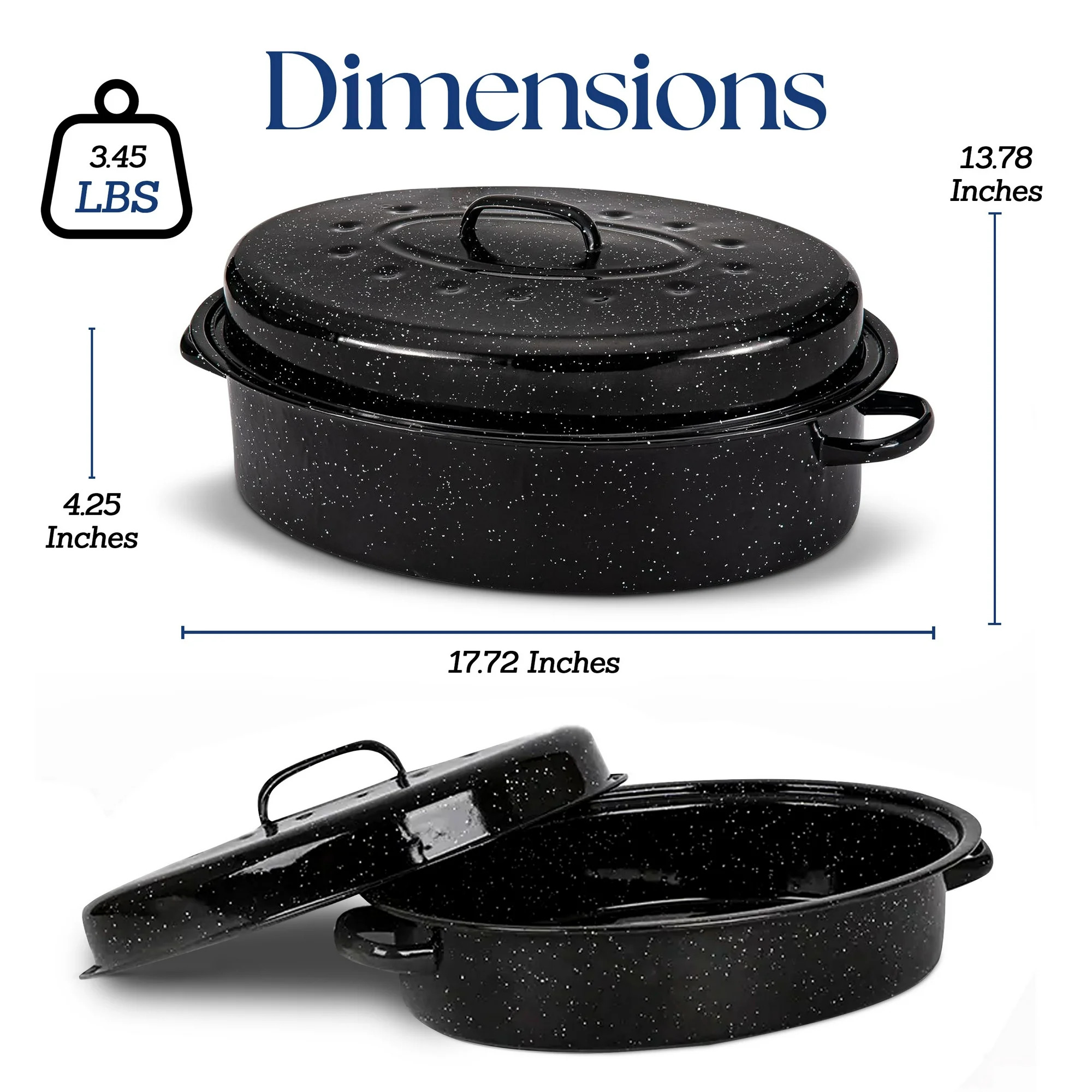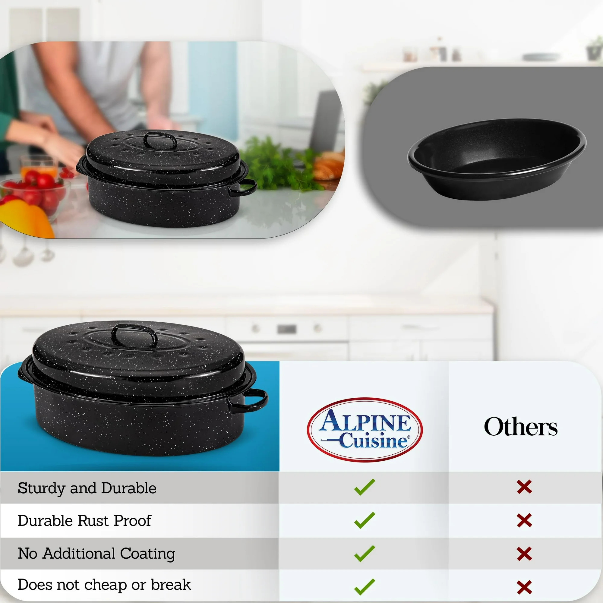 - ALPINE CUISINE OVAL ROASTER: An Alpine Cuisine roasting pan with a lid and handle promotes healthier cooking. This 18×14-inch enamel roasting pan wonder offers consistent heat distribution and is made of sturdy carbon steel. Ideal for regular cooking, it makes meal preparation easy by streamlining sauces, soups, vegetables, grains, and beans while encouraging healthy cooking.