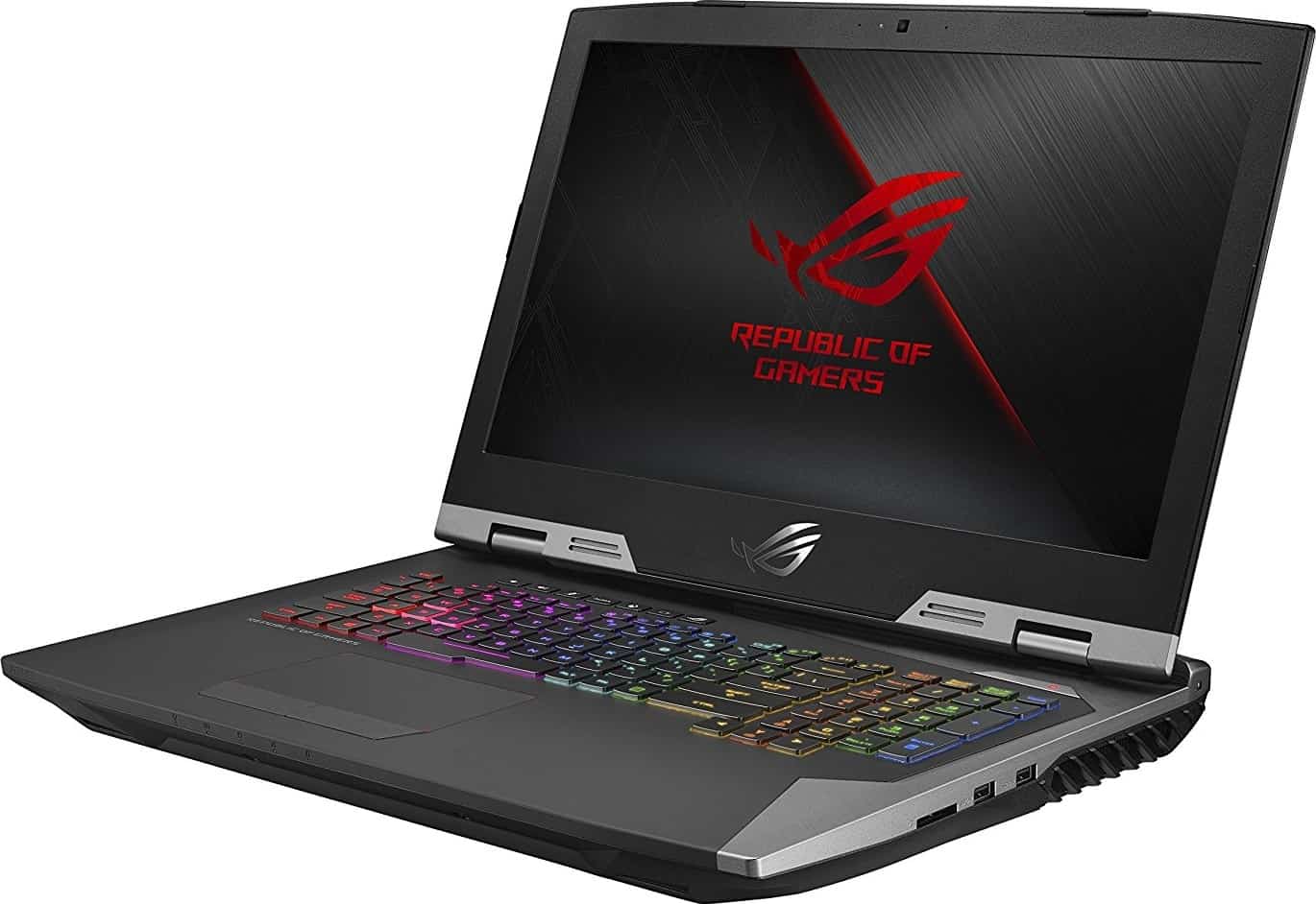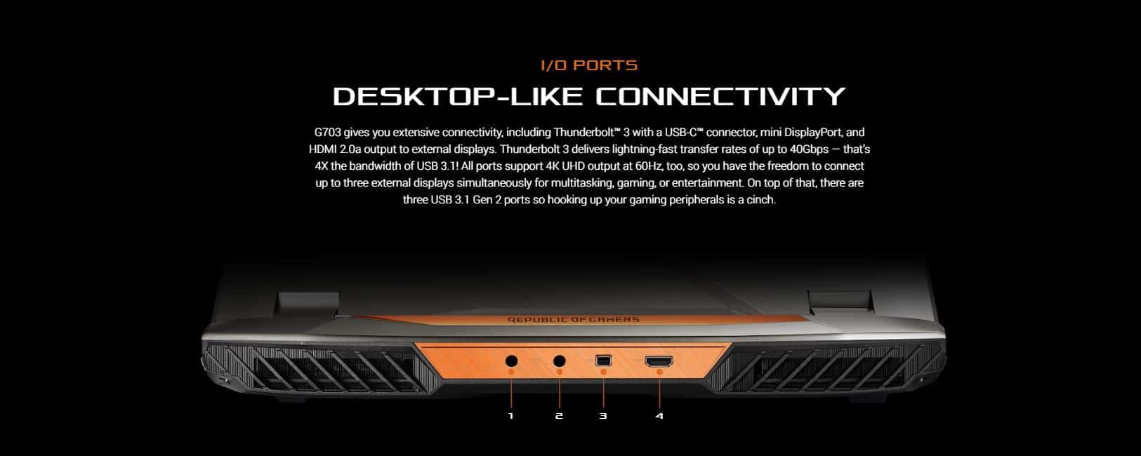 Description : G703 is a beast with the power to take on today’s gaming desktops, thanks to its factory-overclocked 8th Generation Intel® Core™ i9 processor and NVIDIA® GeForce RTX™ 2080 graphics. Designed to play the latest AAA titles on Ultra graphics settings, this powerful Windows 10 Pro laptop features an IPS-level display with a 144Hz refresh rate and ultrafast 3ms gray-to-gray (GTG) response time for smooth visuals with little or no motion blur. ROG-exclusive software lets you switch between an Optimus power-saving mode or NVIDIA G-SYNC™ to experience the smoothest gameplay without stuttering and visual tearing. G703 speeds up loading times with its three NVMe® PCI Express® SSDs in RAID 0 configuration offering read speeds of up to 8700MB/s — the fastest storage ever found on a laptop. Its wireless performance goes above and beyond today’s networking standards; a 2.5G port delivers speeds more than twice the industry while Intel Gigabit Wi-Fi reaches up to 1.7Gbps — 12X-faster than 802.11b/g/n1!