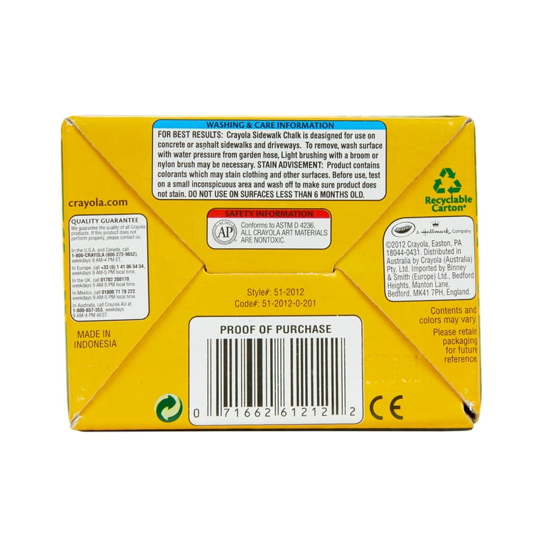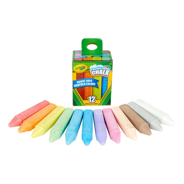 Create BIG outdoor art with the ONLY sidewalk chalk in bright, bold Crayola crayon colors! The Anti-Roll shape keeps sticks handy without rolling away and produces fine lines or broad strokes that simply wash away with water. Includes 12 Sidewalk Chalk sticks in exclusive Crayola crayon colors. Crayola 12 Count Sidewalk Chalk