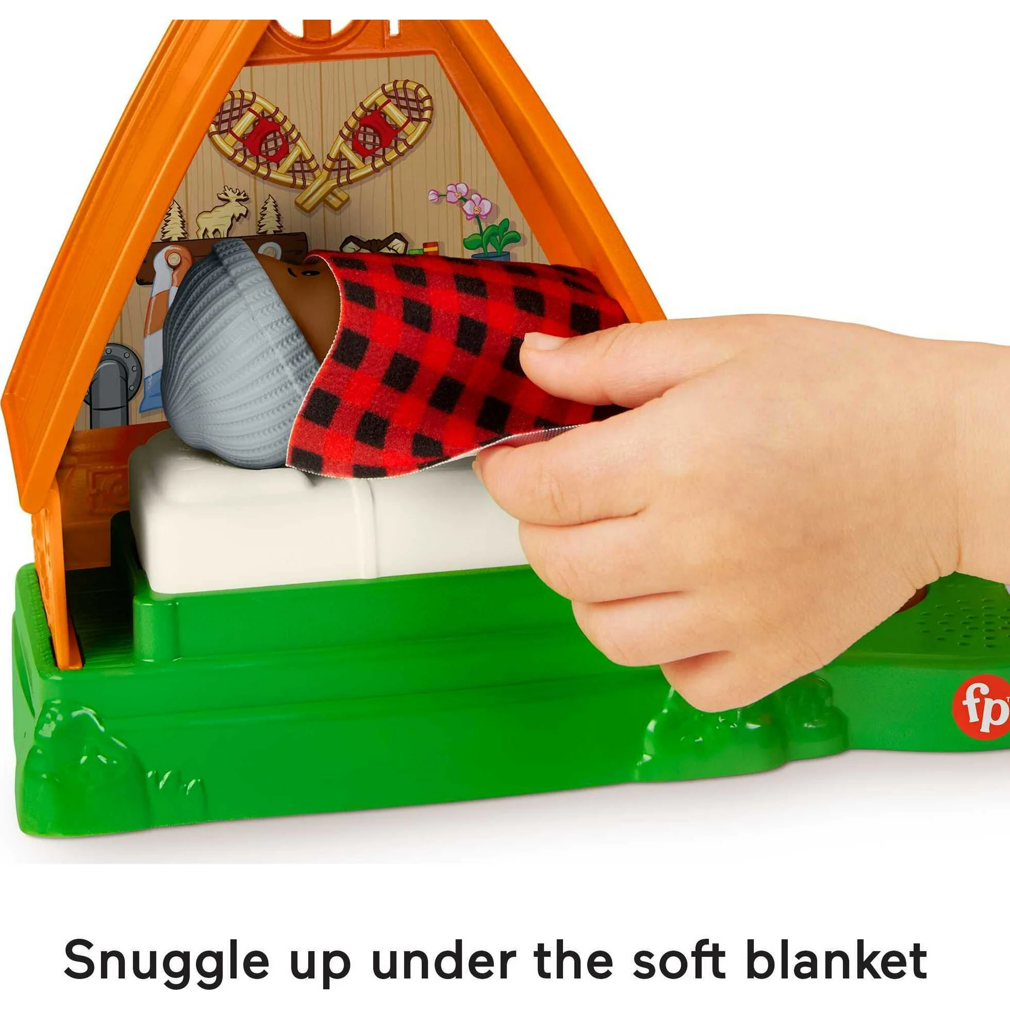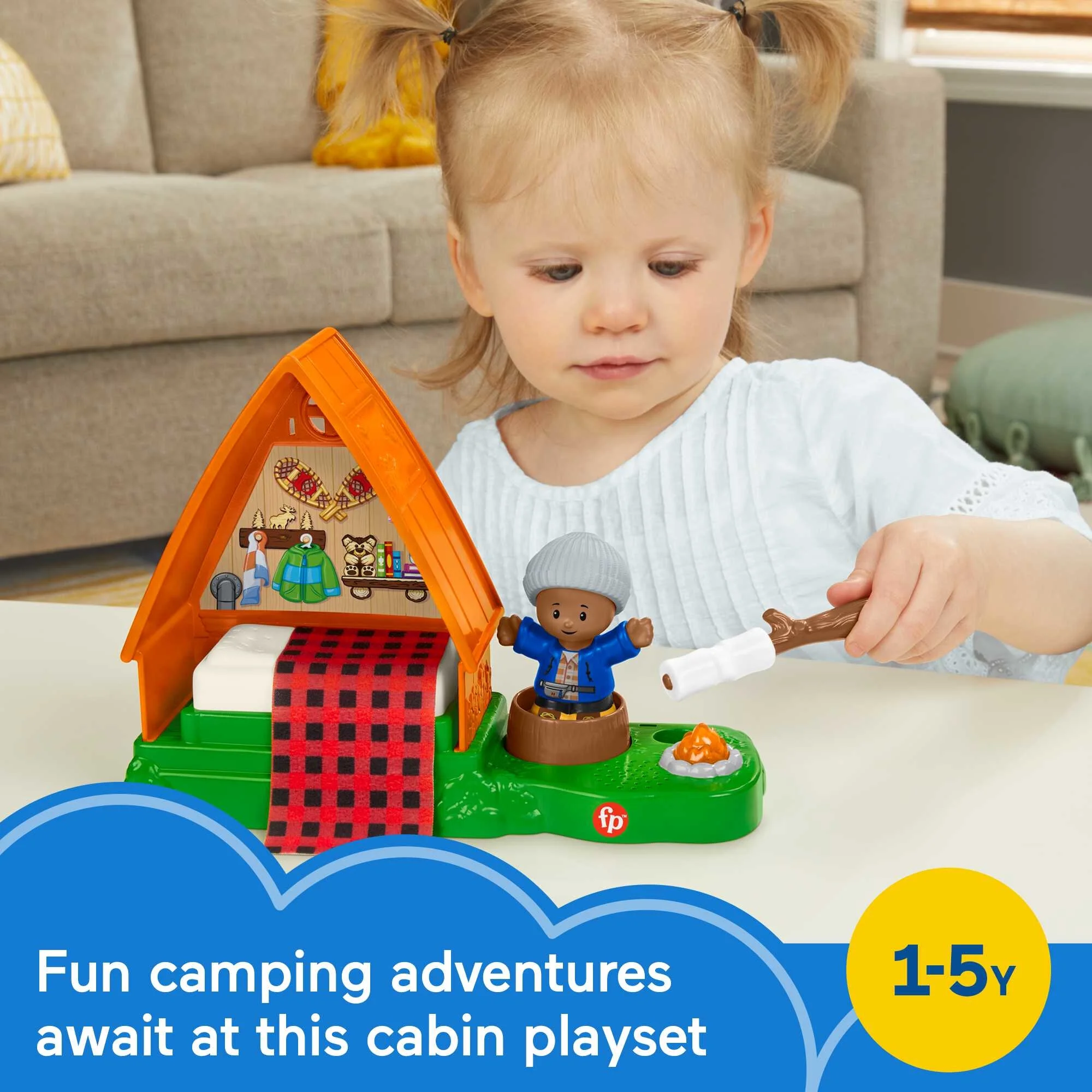 - Includes cabin playset with soft blanket, camper figure, and marshmallow roasting stick accessory