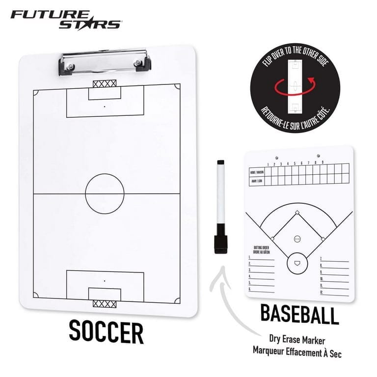 Future Stars 2 in 1 Sport Dry-Erase/Clipboard – Soccer & Baseball. Perfect for use coaching or learning about the game, strategizing and planning game plans! 1 Side is a full Soccer field which is perfect for coaches of soccer teams to use during practice to explain and show the team drills and where each player should be. Also perfect for soccer coaches to set the lineup for each game, outlining each players position and then using the dry erase marker, erase and replace a player with the substitution! On the 2nd side is a baseball diamond! Coaches can set the offensive and defensive lineups and track the score totals by half inning!
