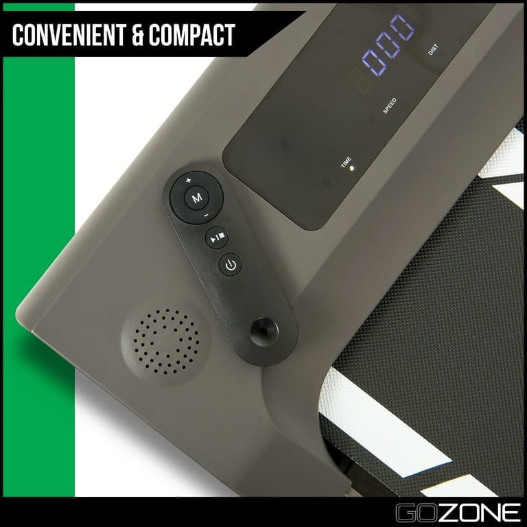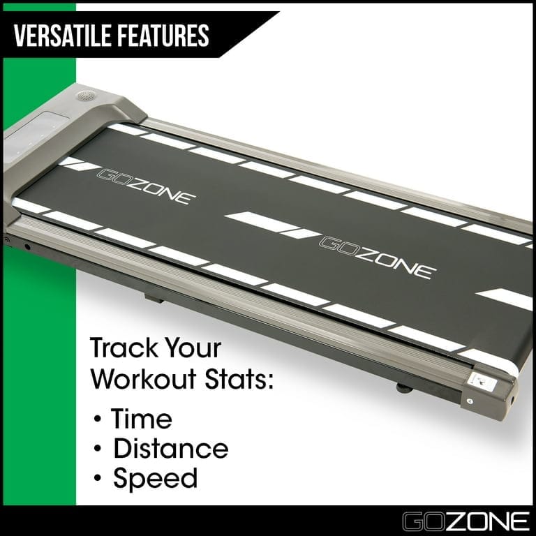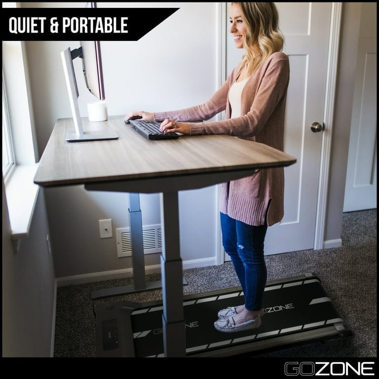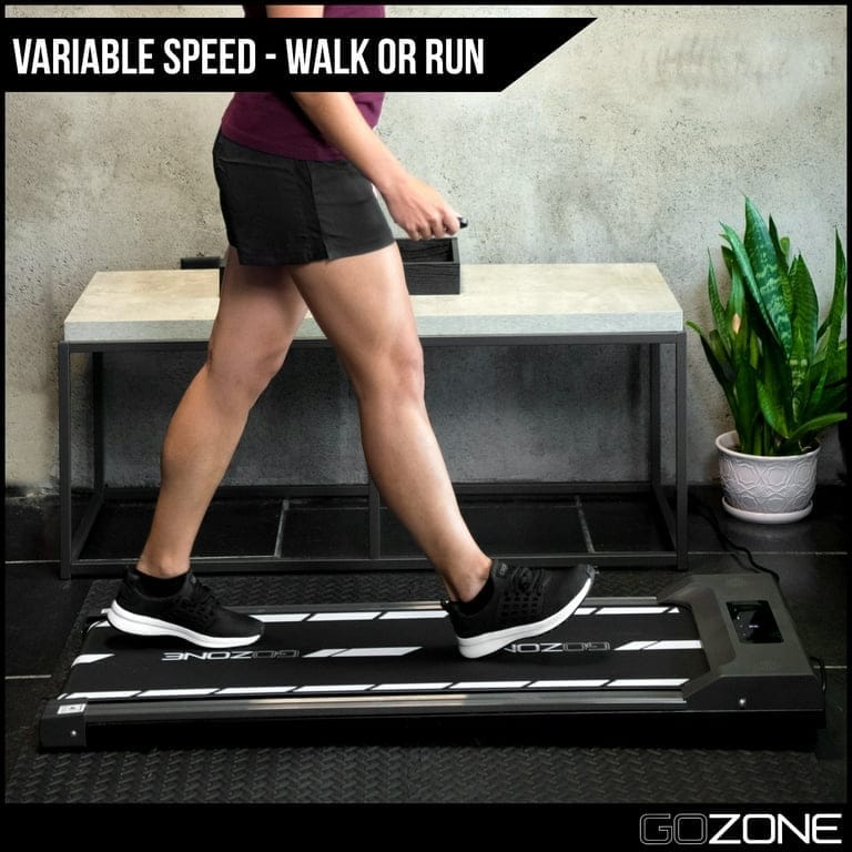 Exercise can be hard to come by with a demanding job; with the GoZone portable treadmills, you can maintain a healthy and active lifestyle while speaking with clients, sending emails or working on big presentations. The indoor walking machine features variable speeds so that you leisurely stroll or jog in place while working, features an automatic countdown timer, and tracks your workout stats such as time, speed and distance. The slim design of the small compact treadmill allows it to be easily storable under a standing desk or bed and features built-in wheels for convenient transport. This exercise running machine includes a wireless remote control for ease of use and features non-slip feet to keep you securely in place while you walk. The jogging machine features a 250 lb weight capacity and allows you to run up to 6 miles per hour (9.7 kilometers per hour). A walking exercise machine allows you to easily walk or jog at your desk at home or at work, allowing you to stay active and healthy while chatting with clients, sending emails, and working on presentations. The quiet treadmill features variable speeds from walk to run, an automatic countdown when the treadmill starts and can track your workout stats, including time, distance, and speed; wireless remote control included. The slim design of the electric treadmill allows it to be easily kept under a standing desk or stored under a bed, and features built-in transport wheels for easy portability; ideal for apartments and small office spaces. Treadmill workstation desk features non-slip feet to keep you securely in place, and features a printed tread with dotted lines so that you stay centered. The mini treadmill features a weight capacity of 250 lbs, and allows you to run up to 6 miles per hour (9.7 kilometers per hour).