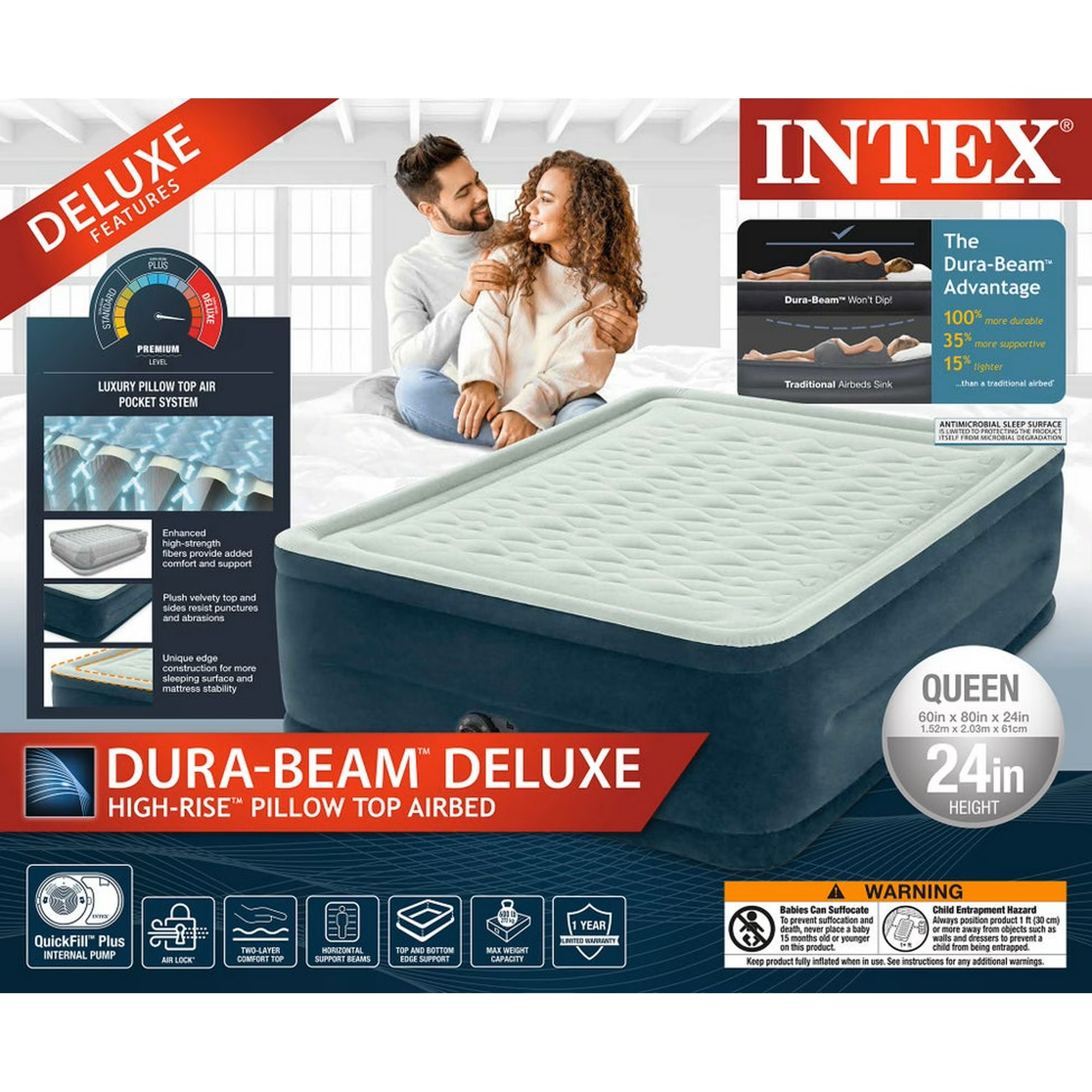 - INTEX Dura-Beam Deluxe High-Rise Pillow Top Air Mattress, 24in. Queen