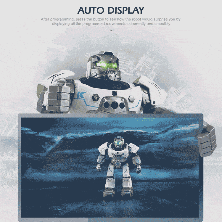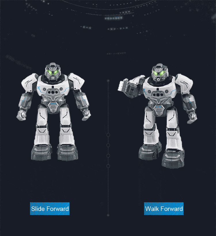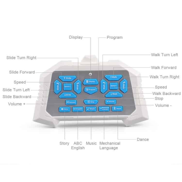 10. Features: Slide forward/backward, slide turn left/right, walk forward/backward, walk turn left/right, auto follow, programing, dance, speed fast / slow switching, auto presentation, volume control, story, English, mechanical language, music, stop.