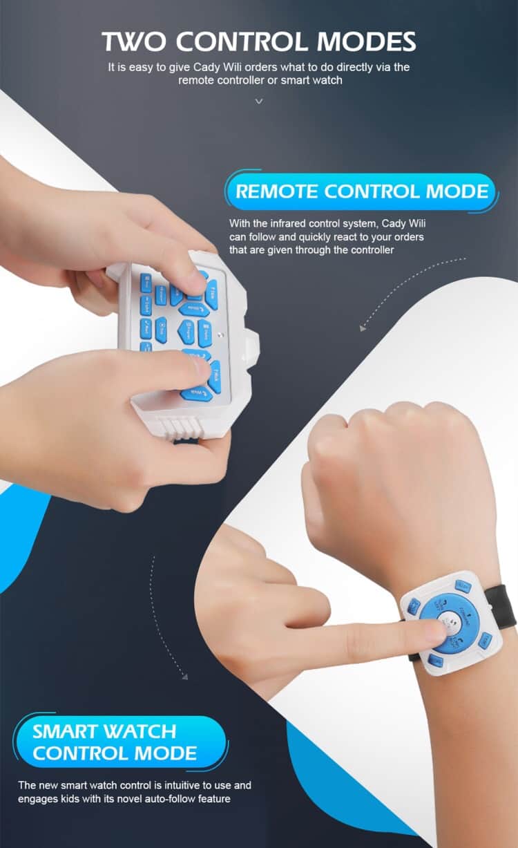 3. Two control modes: It is easy to give robot orders what to do directly via the remote controller or smart watch.