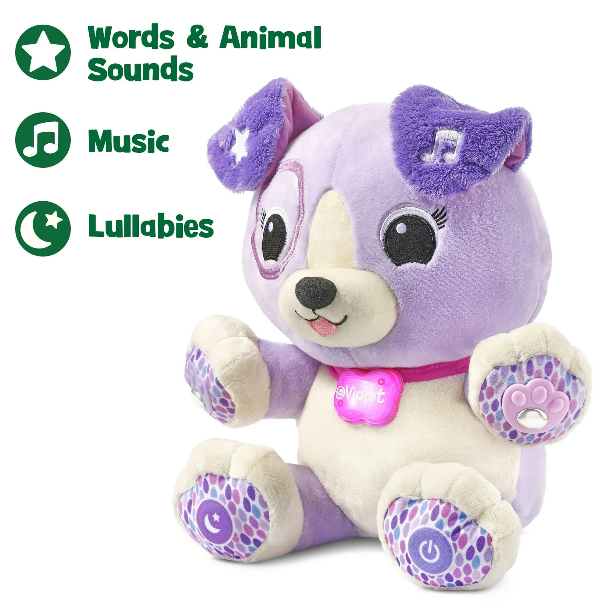 - Violet’s right back paw button activates nighttime mode which plays soft lullabies while her light-up collar glows softly