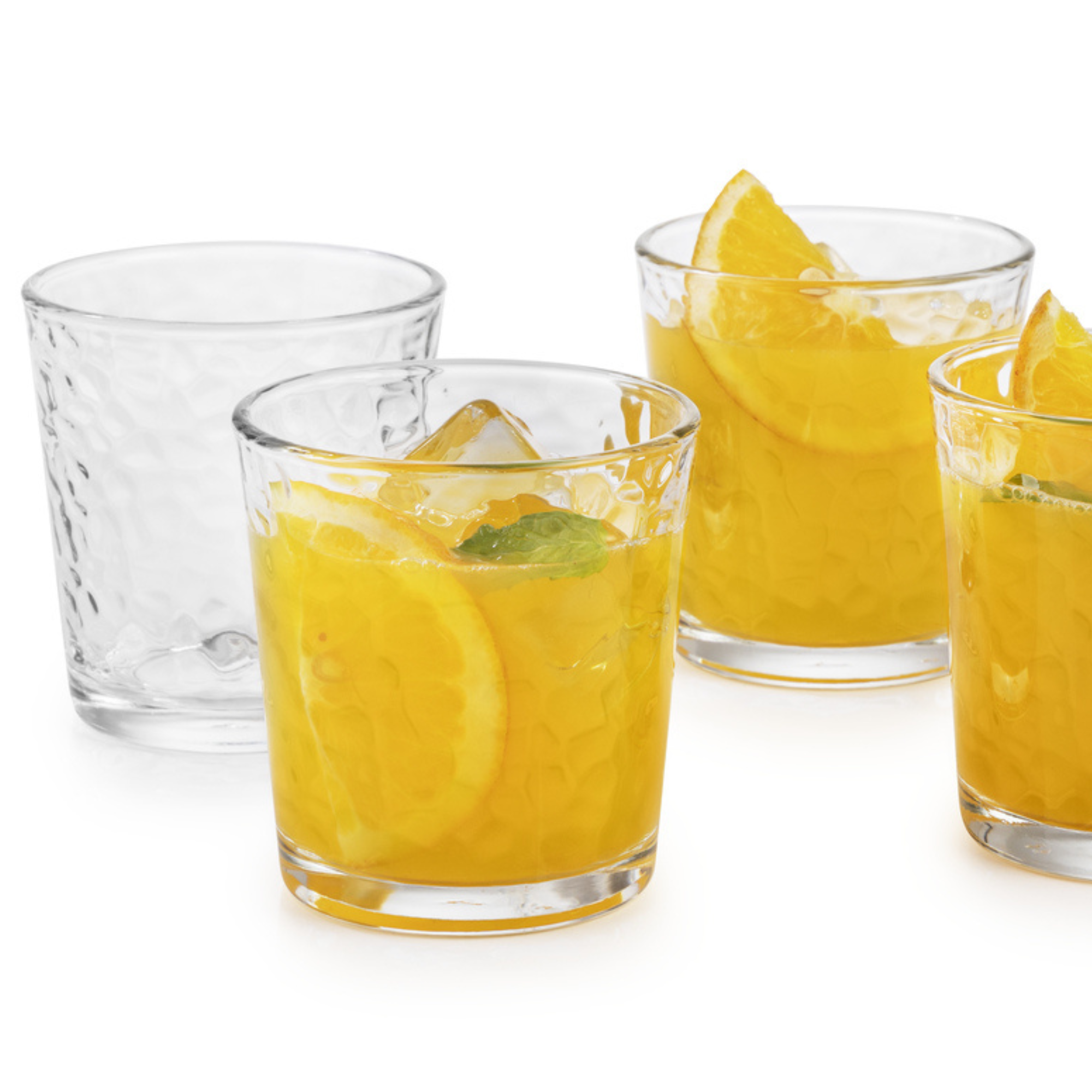 - Four 13-ounce heavy base juice glasses