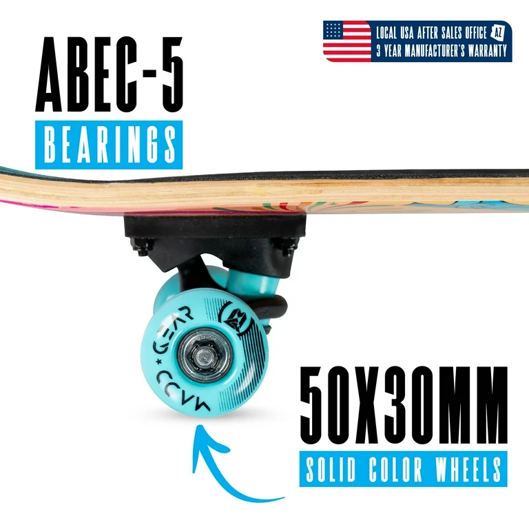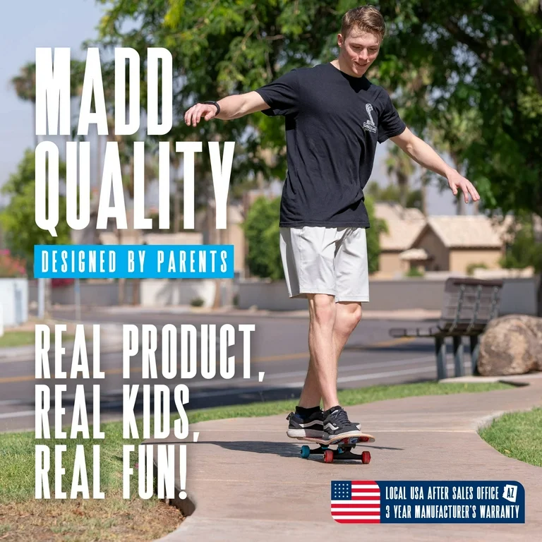 The Madd Gear 31″ Complete Learn to Skate range of boards are ideal for beginners looking for their first real skateboard. From riding down the sidewalk, to school or down at your local skatepark – the Madd Gear 31-inch complete skateboard will get you rolling in style. The Madd Gear 31″ Beginner Skateboard is designed for kids and teens who are just starting out and looking to get the feel for learning tricks. You’ll be the envy of your neighborhood or skatepark on the 31″ Madd Gear Learn to Skate Complete! Available in a range of vibrant graphics and colors, you’ll easily find one that suits your style. It’s Durable, Lightweight and Great for Beginners! The lightweight design is perfect for cruising or popping your first ollie. The 9 Ply Maple Double Kick Concave deck makes it easy for riders to gain stability and traction on their deck. This learn to ride deck has 50 mm x 30 mm PVC wheels and ABEC-5 Bearings.