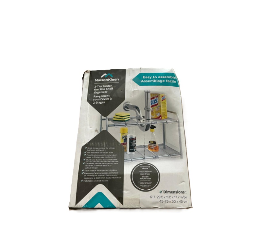 Our 2 tier shelf organizer is designed to fit perfectly under your sink with two adjustable height levels. Designed with snap-in shelves to accommodate the drain pipe configuration. It is perfect for your kitchen, bathroom or laundry room. Easy to assemble.