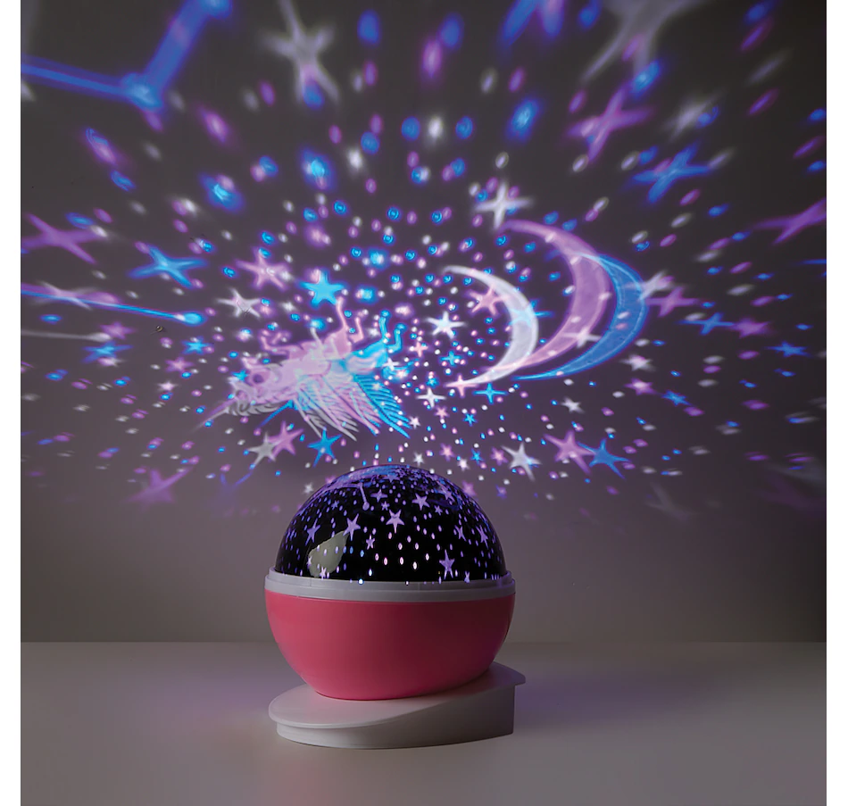 Bring the marvels of space to your ceiling with Galaxy Multi-Color LED Projector Light! This fantastic lamp lights up with white, blue, red, and orange LEDs to throw designs of stars and planets onto your walls for a lovely change to your space. The light can change between steady and rotating effects. Plug it in or use batteries to light up your night with heavenly bodies!