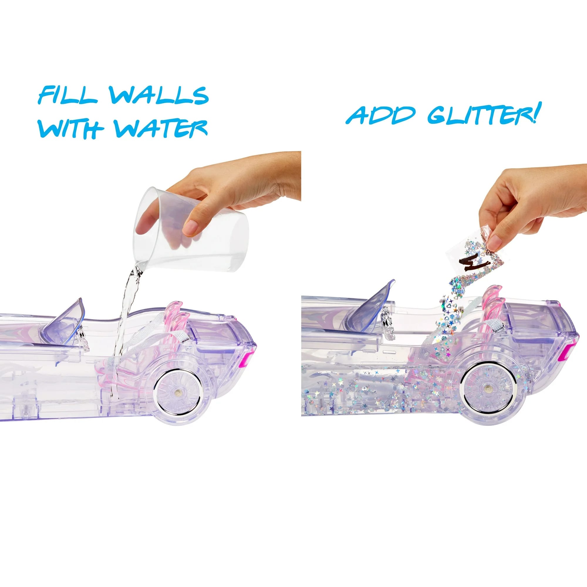 - FILL WITH WATER & GLITTER: This car is made to be played with in and out of water. Remove the covers located at the top of each car door and pour water halfway into the slots on the side of the car. Then add one bag of included glitter and repeat on the other side. Move the car too watch the glitter swirl around!