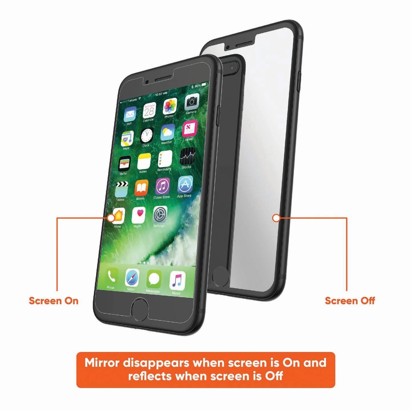 Mirror Glass Screen Protector for iPhone 6 Plus, iPhone 6s Plus, iPhone 7 Plus, iPhone 8 Plus:- Mirror reflects when screen is off and disappears when the screen is on