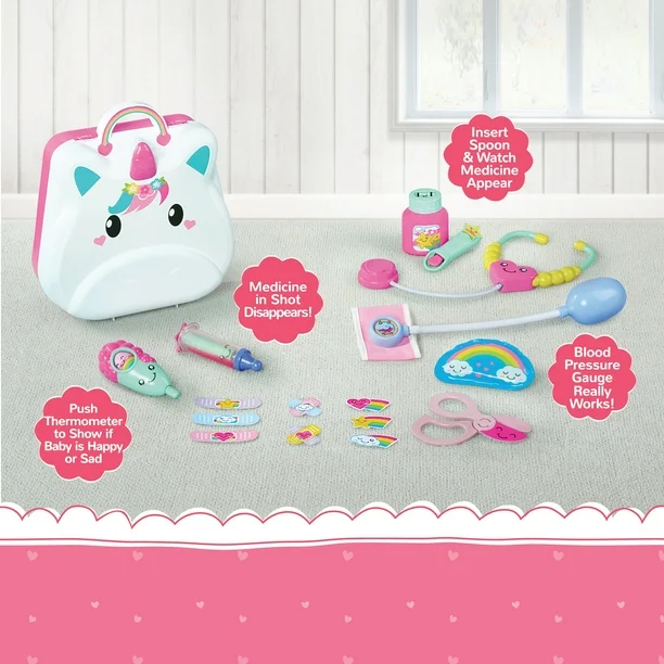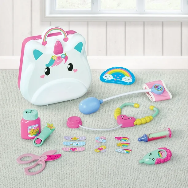 - A great companion set that can be used with your child’s favorite baby dolls, stuffed animals, toys, and more (sold separately)Set includes a unicornshaped doctor case, a play stethoscope, magic spoon, medicine bottle, thermometer, syringe, pair of scissors, pretend ice pack, blood pressure gauge, and bandage stickers