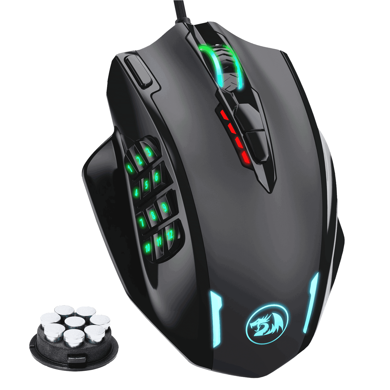 Redragon up to 12,400 DPI High Precision Laser Mouse for PC, 18 Programmable Buttons, Weight Tuning Cartridge, 12 Side Buttons, 5 programmable user profiles, 16.8 Million Customizing LED Color Option
