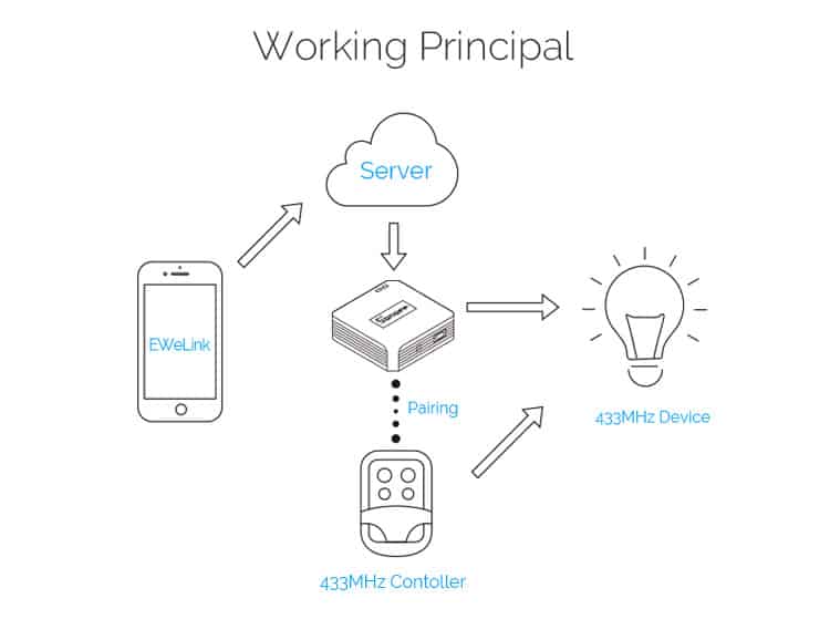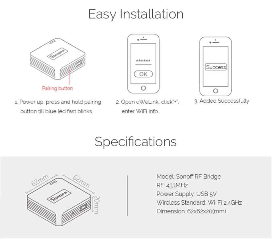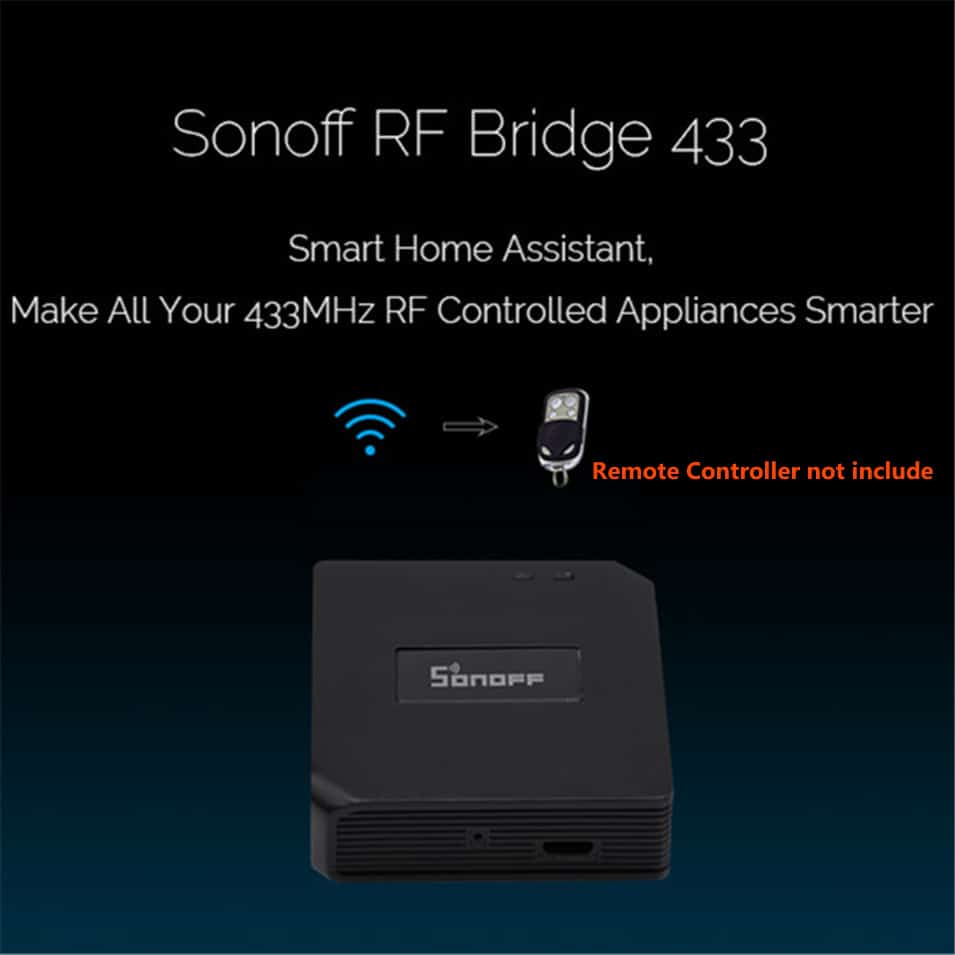 Description : This RF Bridge can convert most of the 433MHz RF Remotes into WiFi wireless. By adding the RF wireless Bridge to iOS/Android App eWeLink WiFi wirelessly, you can add up to four 1-4 buttons 433MHz Wireless RF Remotes to the RF Bridge device. After pairing the RF Remote buttons with RF controlled devices, you can directly control maximum 16 RF controlled devices on the App through WiFi/2/3/4G network. It can be used for most of the 433MHz RF Remote controlled products, like RF controlled switch, RF controlled socket, RF controlled bulb, RF controlled door opener, etc. Even more exciting is that it will work with door magnetic sensor, human body IR sensor, and more other sensors to realize security alarm, and allowing you to DIY smart scenes. This model supports Amazon Alexa and Google Home voice control. Note 1: The receiving supports fixed code 433 frequency, like PT2260, PT2262, PT2264, EV1527, etc. Not support to learn rolling code and dynamic code You can't see device status changes in the App. Note 2: What's new in Android & iOS 2.5.0? Scheduled/countdown timers are supported. iOS App supports to add this product. RF curtain switch and RF alarm are supported. Works With Amazon Alexa To control Sonoff RF Bridge, you'll need to say RF Remote name and button name together. Standard voice control commands phrases (if you just say the RF Remote name, Alexa will turn on/off all buttons of that RF Remote immediately): Alexa, turn on {RF Remote Name} Alexa, turn off {RF Remote Name} Alexa, turn on {RF Remote Name} {ButtonName} Alexa, turn off {RF Remote Name} {ButtonName} Product Features : Convert 433MHz RF Remote to App via WiFi Make 433MHz RF devices App remote controllable Support to add max. four 433MHz RF Remote/Curtain Switch/Alarm Support to control up to sixteen 433MHz RF devices Control 433MHz RF devices over Wi-Fi or mobile network Free iOS and Android mobile app eWeLink Works perfectly with Amazon Alexa, Google Home