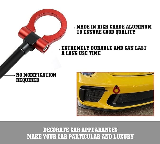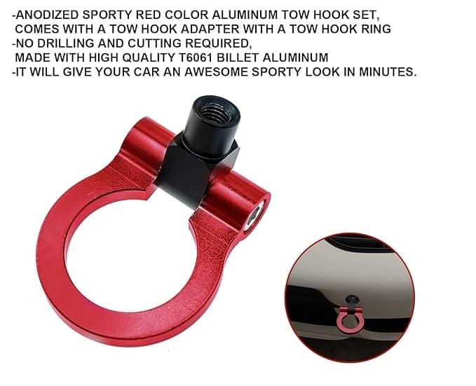 • Package Content: One piece of sport racing style red aluminum tow hook including a tow hook adapter and a tow hook ring.