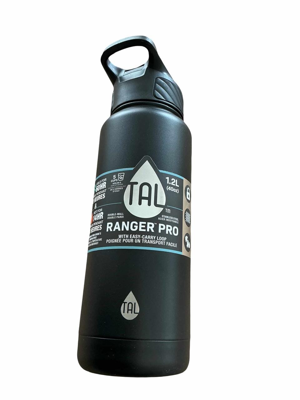 TAL Stainless Steel Ranger Tumbler Water Bottle 40 fl oz, Black is designed for maximum temperature retention. Keeps beverages hot or cold. Easy opening for cleaning and adding ice. Condensation and BPA free. Eco-friendly.
