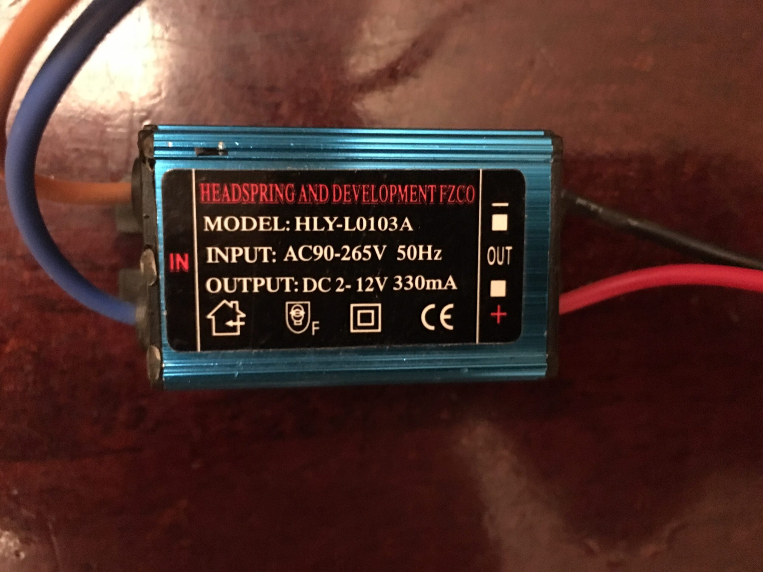 Model: HLY-L0103A Input: AC90-265V 50Hz Output: DC2-12V 330mA