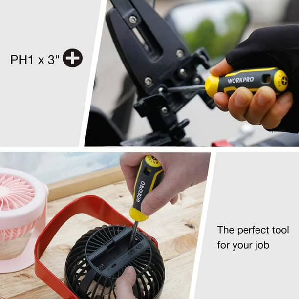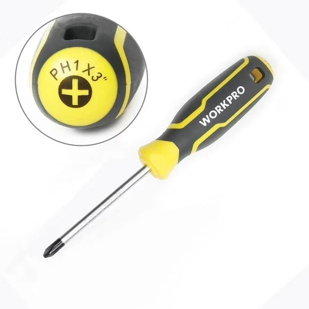 WorkPro Screwdrivers are ideal for all your fastening work. The handle is crafted in a special pentagonal shape to provide greater torque and increased comfort, with a unique, dual material design to eliminate grip slippage during high-torque applications. The tip size markings are injected on the end of the handle for easy identification, while the alloy steel blades are heat treated for strength and the precision formed tips ensure an accurate fit to limit cam-out. The PH1 tip size and 3-inch shaft length has been laser etched into the shaft for easy identification and the molded polypropylene and TPR rubber handle provides a secure and comfortable grip. This screwdriver is perfect for electronics or small appliance repairs in addition to everyday home repair and jobsite tasks.